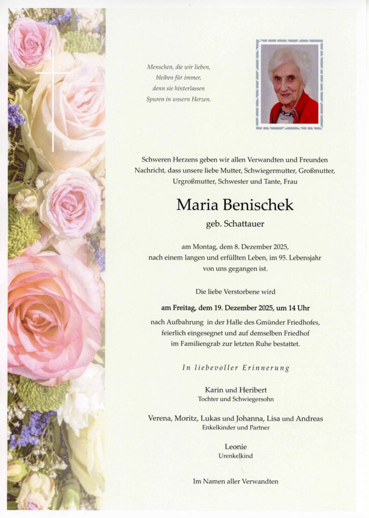Wir trauern um: Benischek Maria † 08.12.2025 Gmünd - KleineibensteinBegräbnis 19.12.2025, 14:00 Uhr Aufbahrungshalle Gmünd Parte Kondolenzbuch (0) Gedenkkerzen (4)