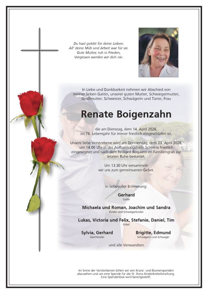 Wir trauern um: Boigenzahn Renate † 14.04.2026 SchremsBegräbnis 23.04.2026, 14:00 Uhr Aufbahrungshalle SchremsSonstigesUm 13.30 Uhr versammeln wir uns zum gemeinsamen Gebet. Parte Kondolenzbuch (13) Gedenkkerzen (16)