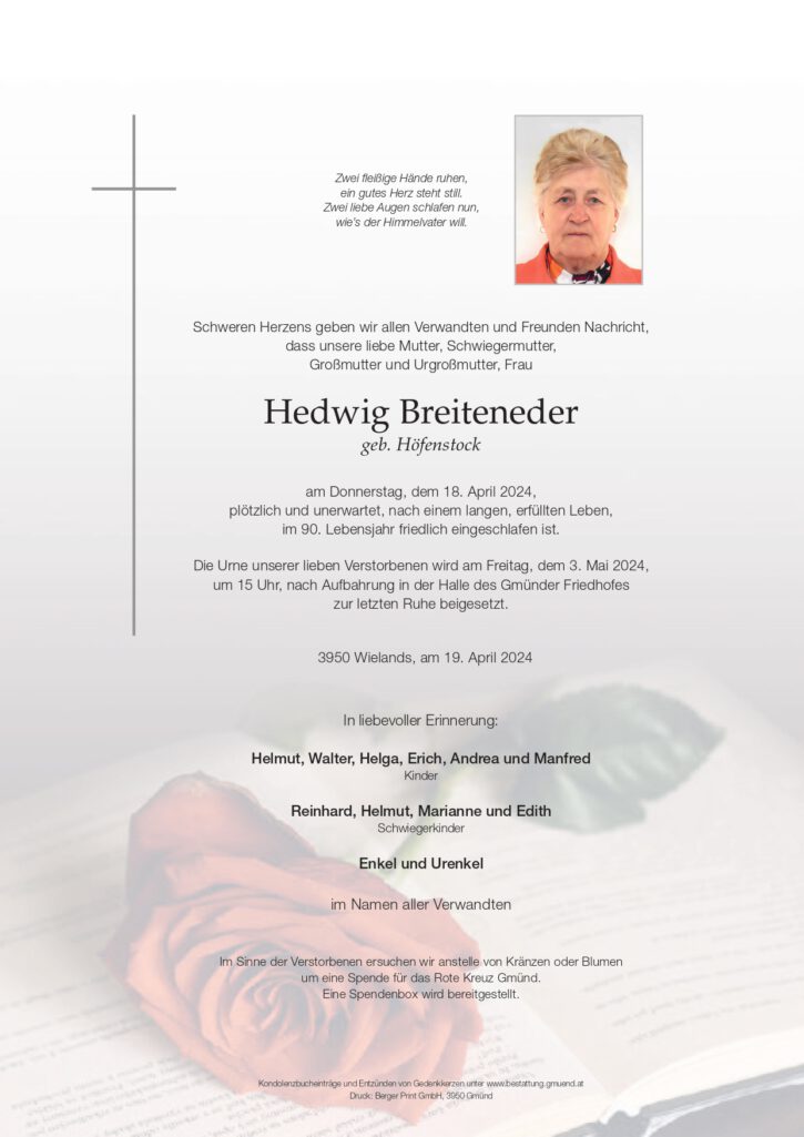 Wir trauern um: Breiteneder Hedwig † 18.04.2024 WielandsUrnenbeisetzung 03.05.2024, 15:00 Uhr Aufbahrungshalle Gmünd Parte Kondolenzbuch (6) Gedenkkerzen (17)