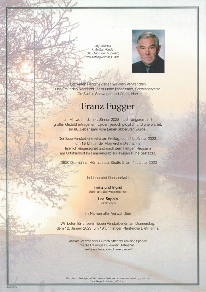 Wir trauern um: Fugger Franz † 04.01.2023 GmündBegräbnis 13.01.2023, 15:00 Uhr Kirche Dietmanns Parte Kondolenzbuch (13) Gedenkkerzen (25)