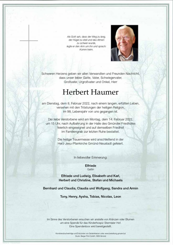 Wir trauern um: Haumer Herbert † 08.02.2022 GmündBegräbnis 14.02.2022, 15:00 Uhr Gmünd Parte Kondolenzbuch (7) Gedenkkerzen (10)