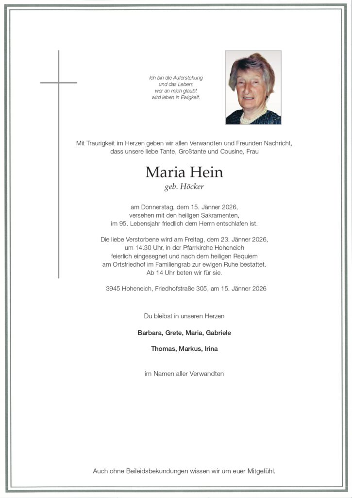 Wir trauern um: Hein Maria † 15.01.2026 HoheneichBegräbnis 23.01.2026, 14:30 Uhr Pfarrkirche Hoheneich Parte Kondolenzbuch (2) Gedenkkerzen (7)