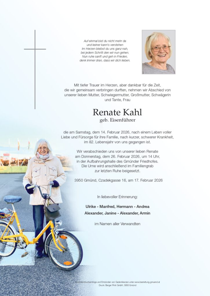 Wir trauern um: Kahl Renate † 14.02.2026 GmündUrnenbeisetzung 26.02.2026, 14:00 Uhr Aufbahrungshalle Gmünd Parte Kondolenzbuch (41) Gedenkkerzen (38)