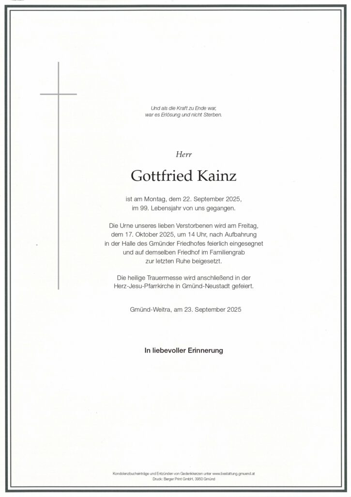 Wir trauern um: Kainz Gottfried † 22.09.2025 Gmünd - WeitraUrnenbeisetzung 17.10.2025, 14:00 Uhr Aufbahrungshalle Gmünd Parte Kondolenzbuch (0) Gedenkkerzen (10)
