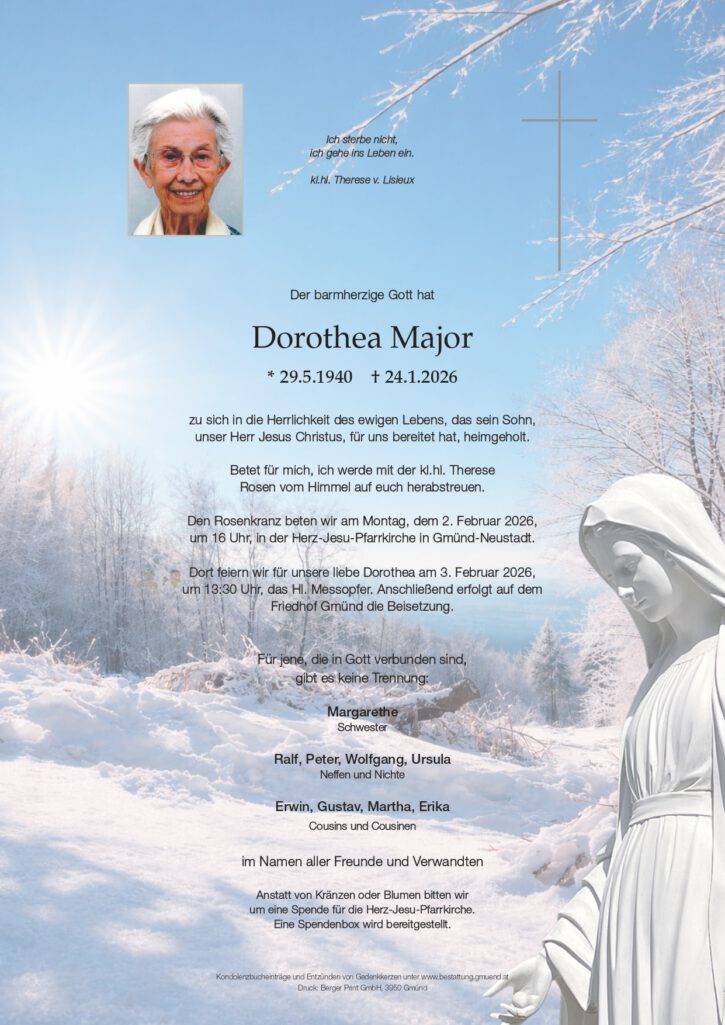 Wir trauern um: Major Dorothea † 24.01.2026 GmündBegräbnis 03.02.2026, 13:30 Uhr Pfarrkirche Herz-Jesu, Gmünd-Neustadt Parte Kondolenzbuch (40) Gedenkkerzen (78)