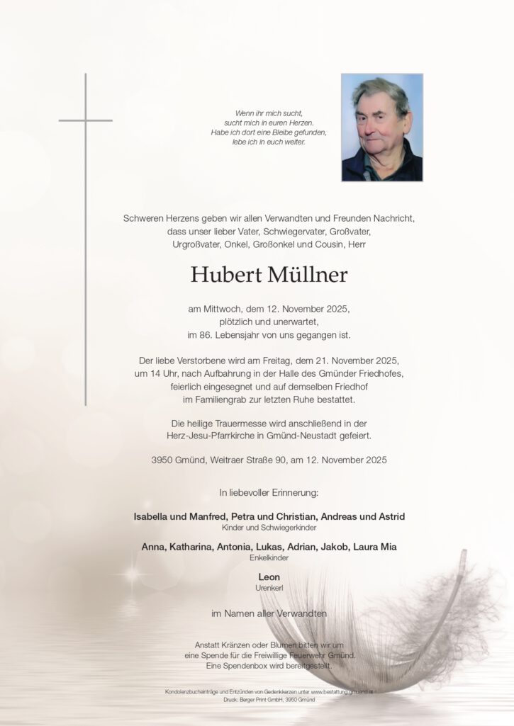 Wir trauern um: Müllner Hubert † 12.11.2025 GmündBegräbnis 21.11.2025, 14:00 Uhr Aufbahrungshalle Gmünd Parte Kondolenzbuch (5) Gedenkkerzen (14)