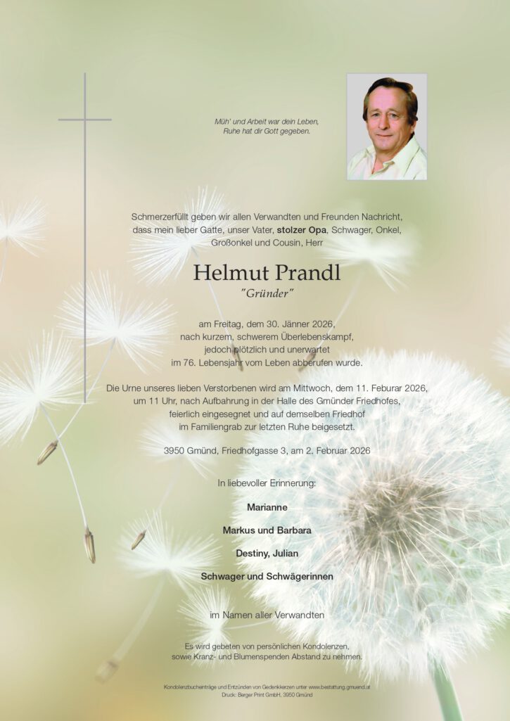Wir trauern um: Prandl Helmut † 30.01.2026 GmündUrnenbeisetzung 11.02.2026, 11:00 Uhr Aufbahrungshalle Gmünd Parte Kondolenzbuch (6) Gedenkkerzen (10)
