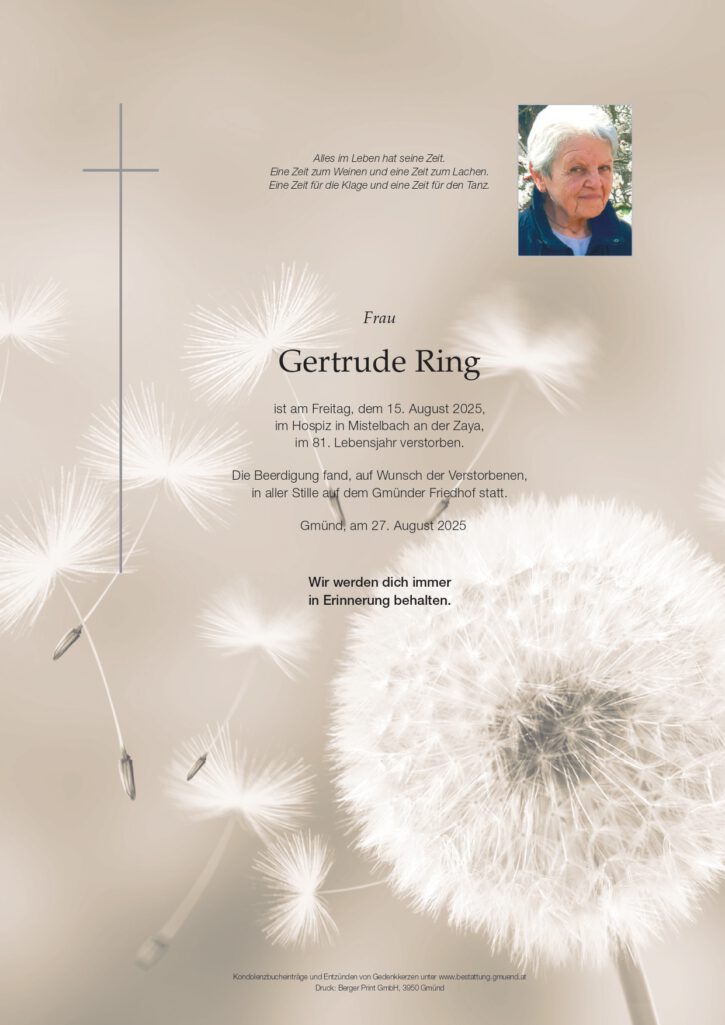 Wir trauern um: Ring Gertrude † 15.08.2025 Gmünd - MistelbachSonstigesDas Begräbnis fand, auf Wunsch der Verstorbenen, in aller Stille statt Parte Kondolenzbuch (3) Gedenkkerzen (17)