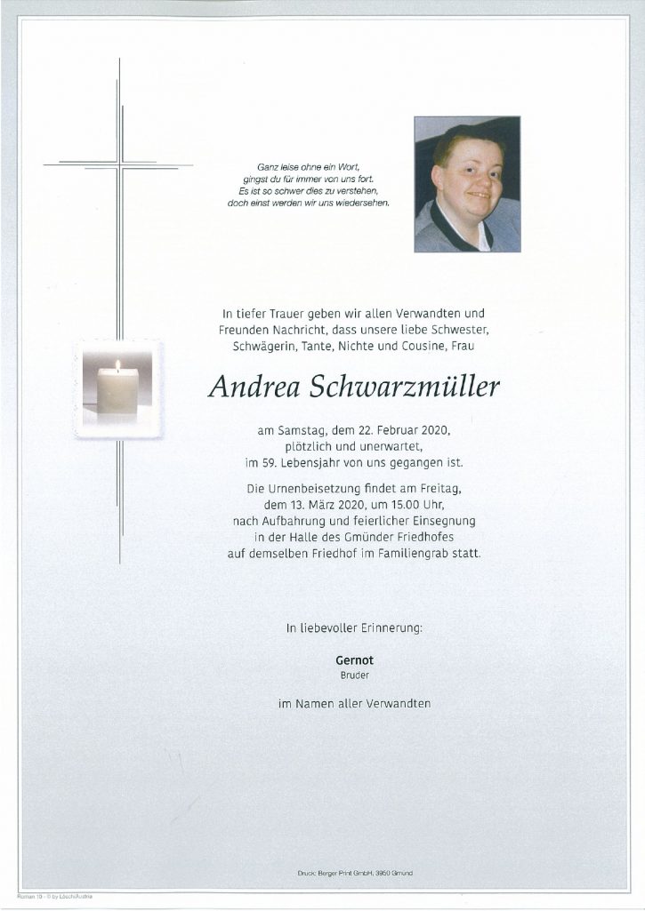 Wir trauern um: Schwarzmüller Andrea † 22.02.2020 GmündUrnenbeisetzung 13.03.2020, 15:00 Uhr Friedhof Gmünd Parte Kondolenzbuch (0) Gedenkkerzen (7)