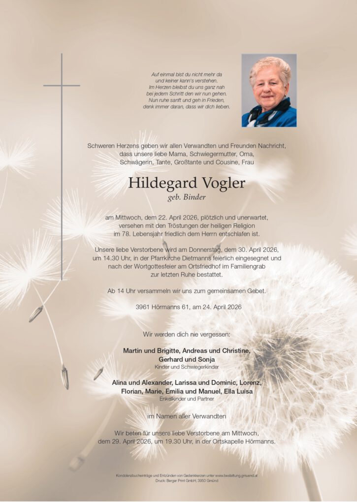 Wir trauern um: Vogler Hildegard † 22.04.2026 HörmannsBegräbnis 30.04.2026, 14:30 Uhr Pfarrkirche Dietmanns Parte Kondolenzbuch (9) Gedenkkerzen (28)