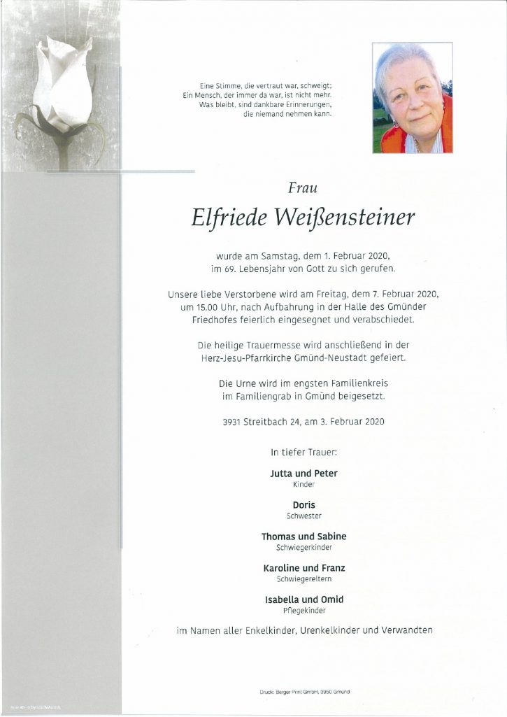 Wir trauern um: Weißensteiner Elfriede † 01.02.2020 ZwettlVerabschiedung 07.02.2020, 15:00 Uhr Friedhof Gmünd Parte Kondolenzbuch (2) Gedenkkerzen (12)
