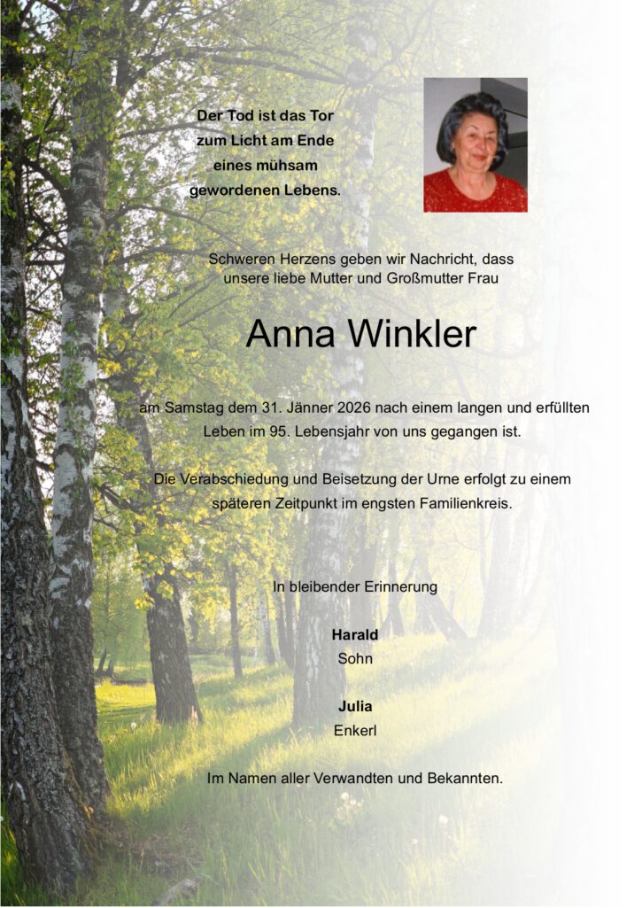 Wir trauern um: Winkler Anna † 31.01.2026 SchremsSonstigesDie Urnenbeisetzung findet im engsten Familienkreis statt Parte Kondolenzbuch (5) Gedenkkerzen (17)