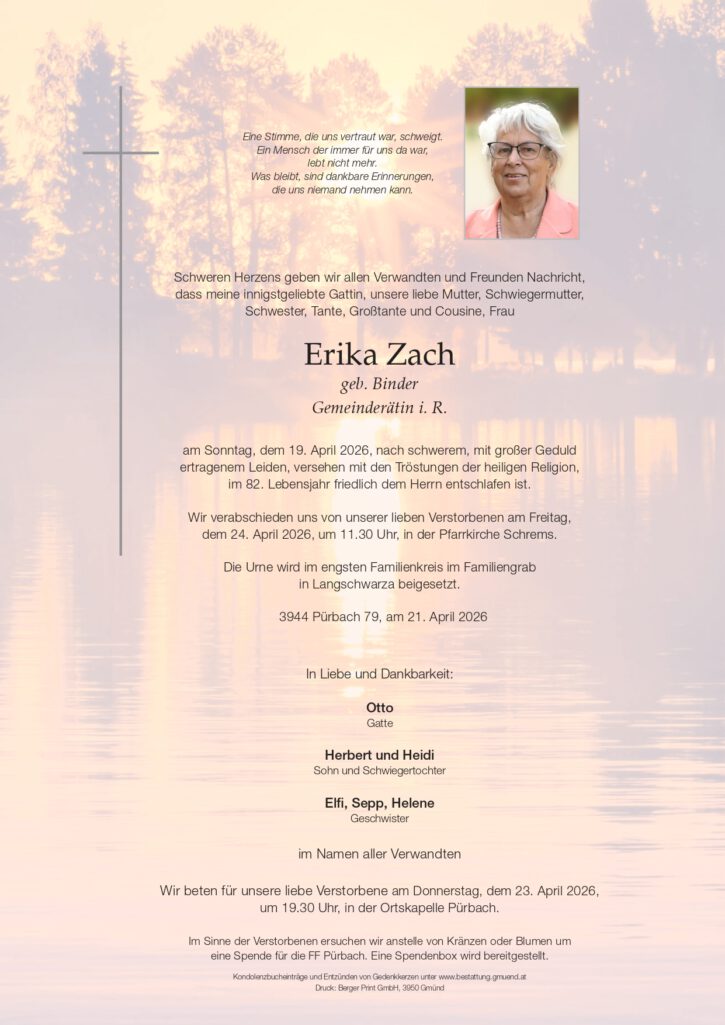 Wir trauern um: Zach Erika † 19.04.2026 PürbachVerabschiedung 24.04.2026, 11:30 Uhr Pfarrkirche Schrems Parte Kondolenzbuch (7) Gedenkkerzen (12)